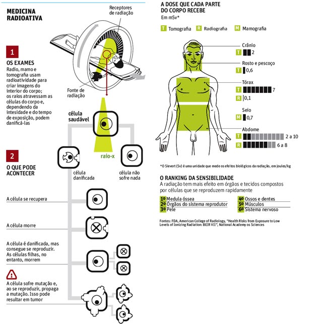 Também são isoladas as iniciativas para se reduzir as doses de radiação. "Eu posso fazer uma tomografia de tórax com uma dose de 20 ou uma dose de 10 e chegar ao mesmo diagnóstico", diz Marcos Menezes, diretor da radiologia do Instituto do Câncer e do Sírio-Libanês.